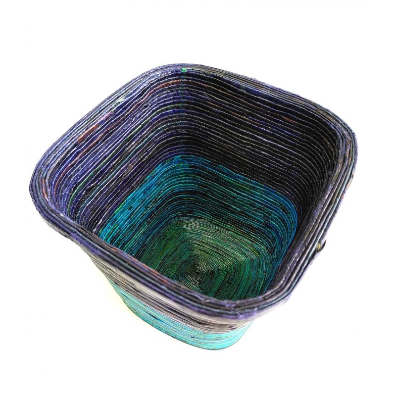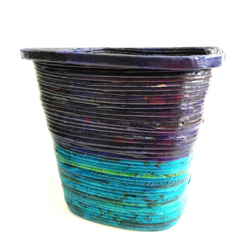 Légère et solide, pratique et décoratif, cette corbeille est faite à la main à partir de papier journal recyclé.