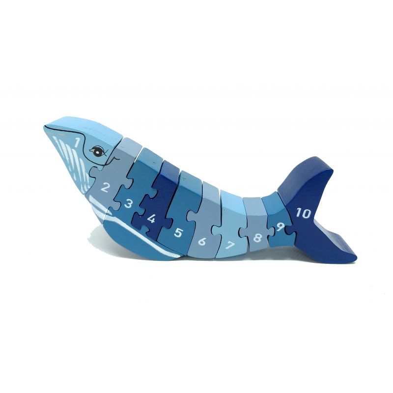 Walvis puzzel om het 1 tot 10 cijfers te leren. Gerecycleerd albizia-hout.