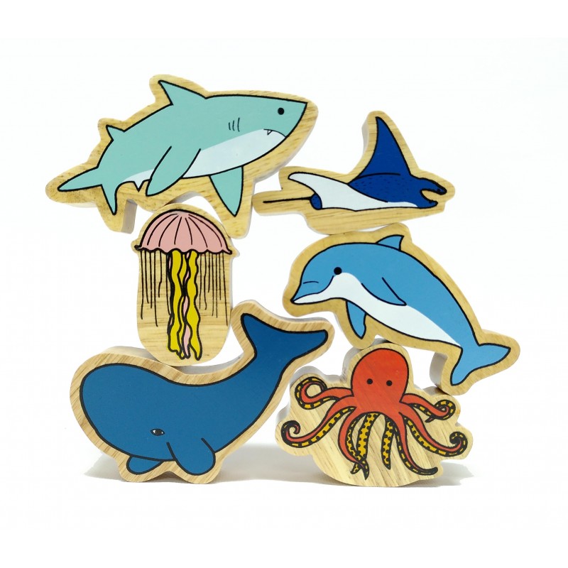 Pak van 6 massief houten zeedieren , gemaakt uit gerecycleerd rubberhout. Kan afzonderlijk worden gekocht.